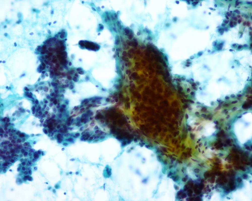 現病歴:1週間前より頸部腫脹を自覚。頸部に軽度圧痛のある弾性硬,可動性不良の8.5x5.0cmの腫瘤を認め,画像上甲状腺右葉に石灰化を伴う腫瘍を認めた。同部より細胞診が施行された。