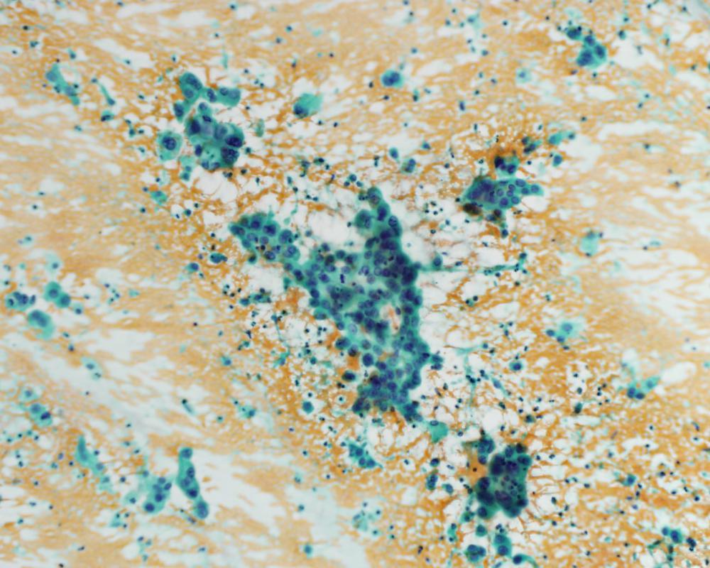現病歴:前立腺癌の経過観察のCTにて右肺結節を指摘された。PSA含めて腫瘍マーカーは正常であった。本標本は術中迅速組織診断用に提出された肺腫瘍の捺印細胞診検体である。